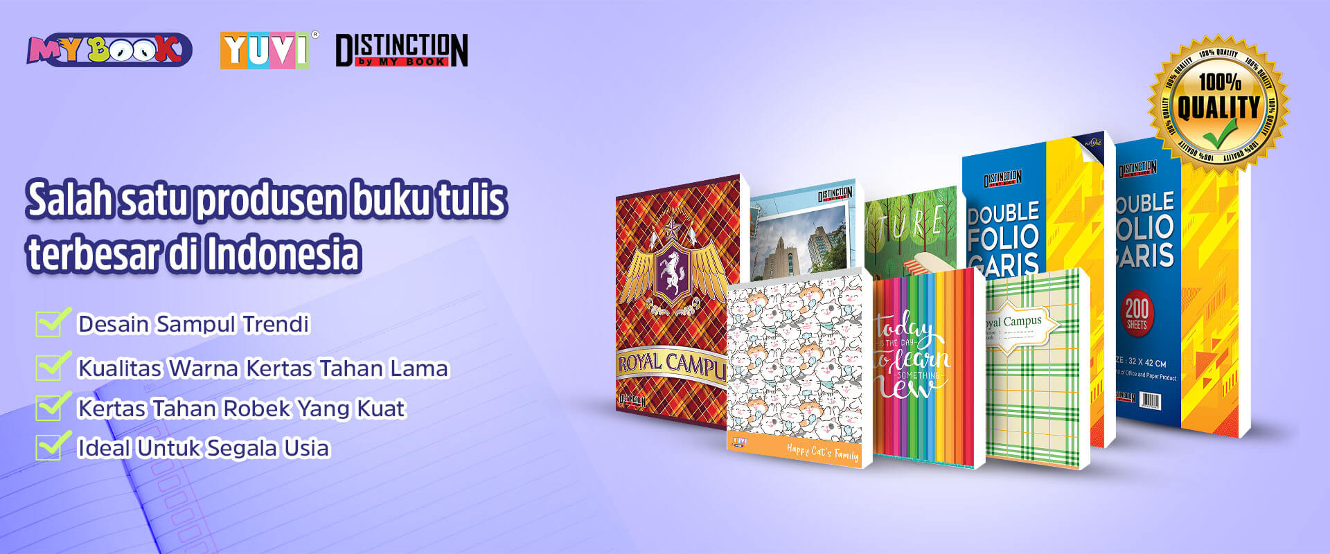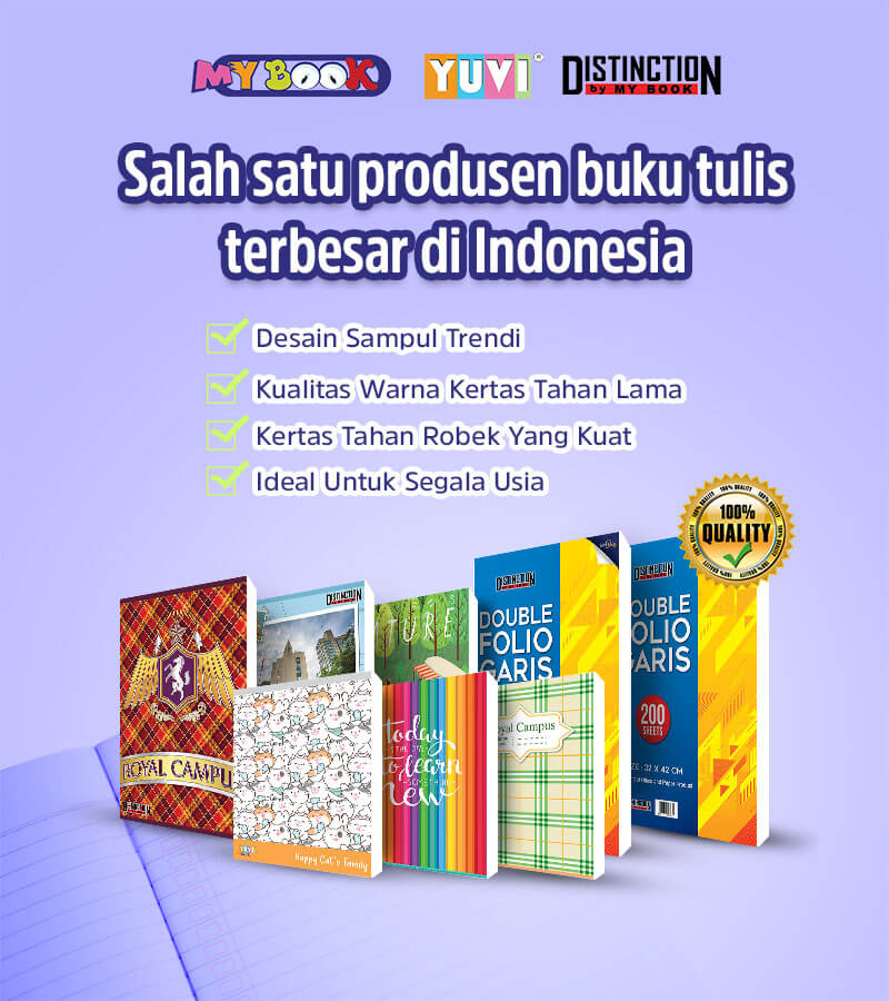 Produk kami mencakup My Book Yuvi, My Book Distinction, dan Double Folio Garis yang terbuat dari kertas PaperOne berkualitas tinggi. Dedikasi kami yang teguh untuk menghasilkan produk unggul selaras dengan para pelanggan kami yang terus mendorong kesuksesan kami dalam industri ini, menjadikan kami salah satu produsen buku tulis terbesar di Indonesia.